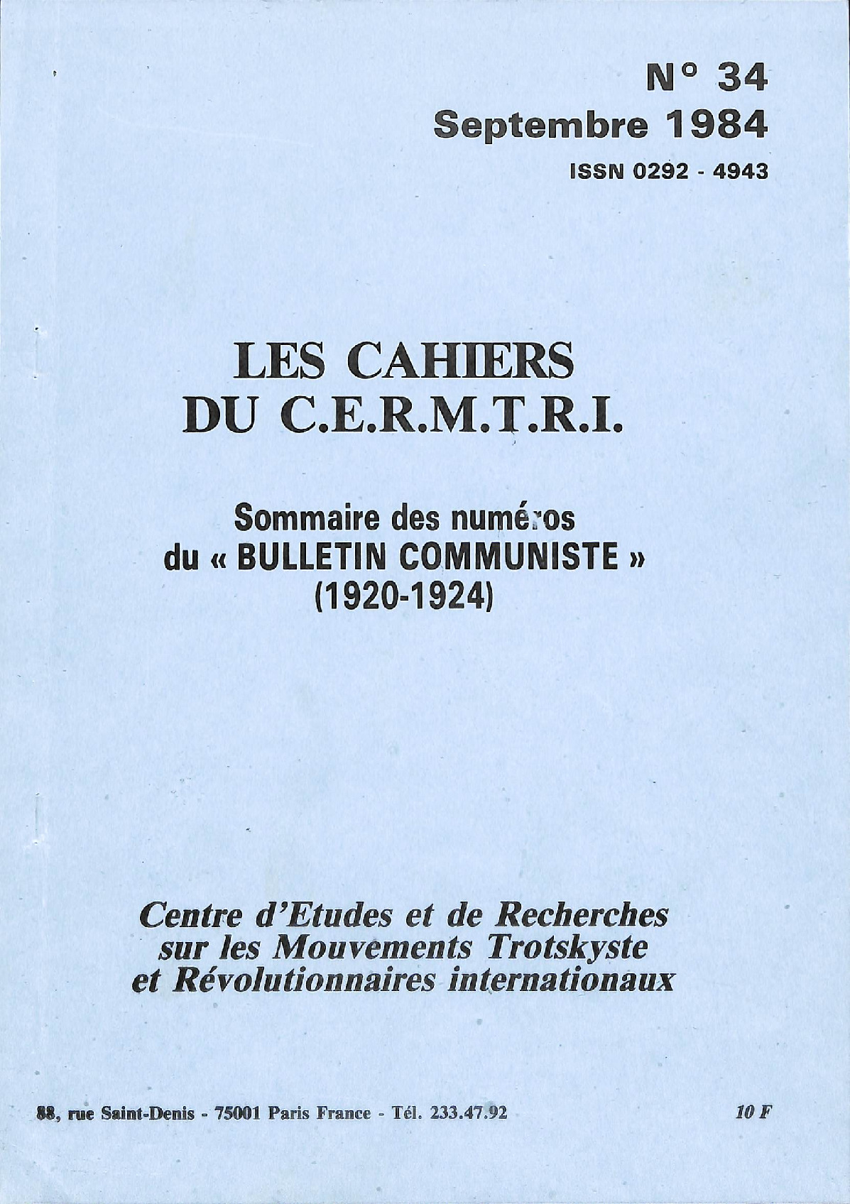 Sommaire des numéros du Bulletin Communiste (1920-1924) Les Cahiers du Cermtri année 1984 n° 34 N° 34 - Septembre 1984 Sommaire des numéros du Bulletin Communiste (1920-1924) Rubrique Les cahiers du Cermtri Étiquettes Inventaires/Catalogues