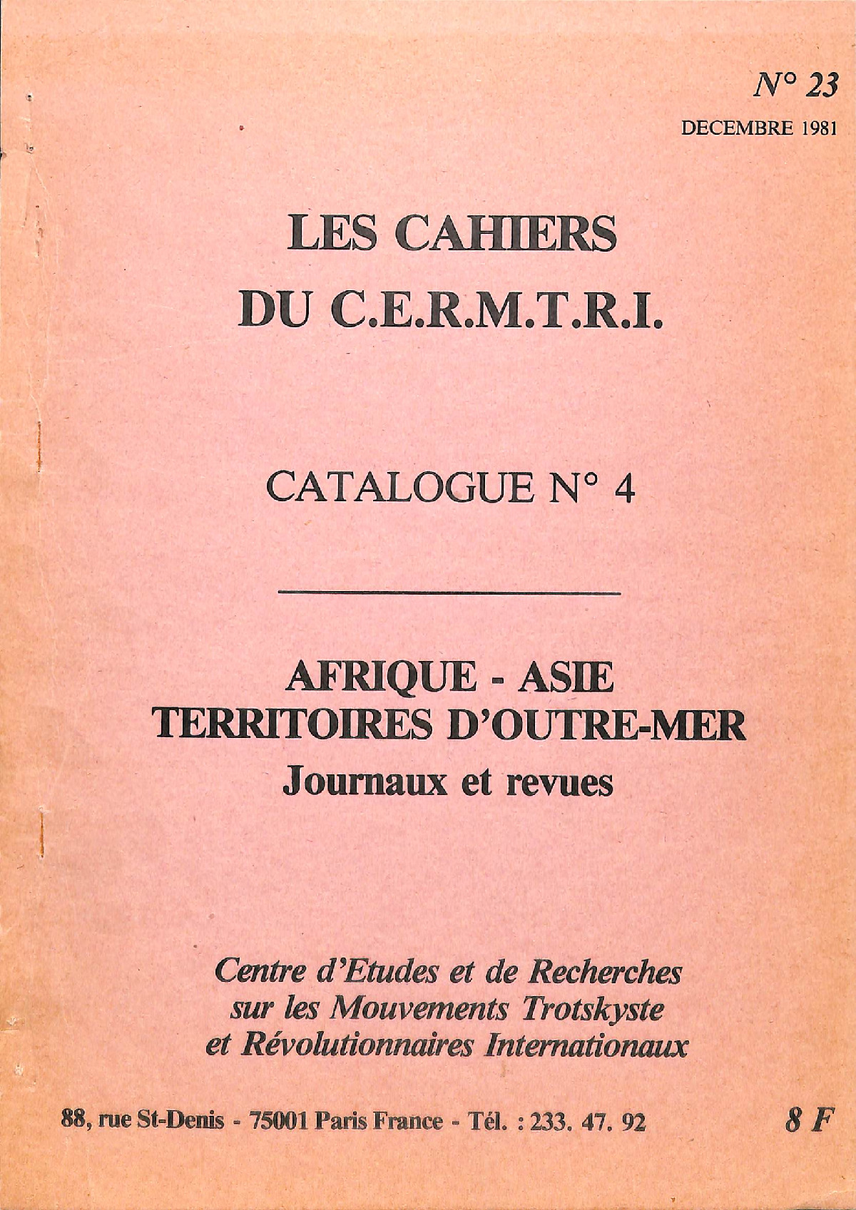 Afrique-Asie, Territoires d’Outre-mer. Journaux et revues Les Cahiers du Cermtri année 1981 n° 23 Rubrique Les cahiers du Cermtri Étiquettes Inventaires/Catalogues