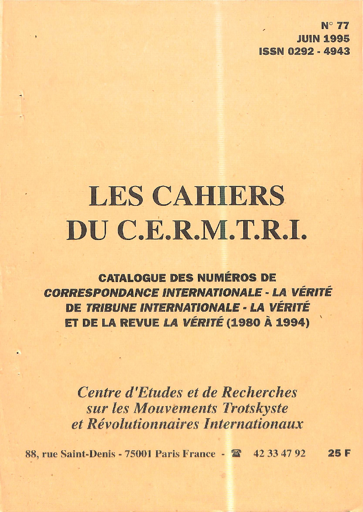 Catalogue des numéros de Correspondance Internationale – La Vérité et de la revue La Vérité (1980-1994) Les Cahiers du Cermtri année 1995 n° 77 N° 77 – juin 1995 Catalogue des numéros de Correspondance Internationale – La Vérité et de la revue La Vérité (1980-1994) Rubrique Les cahiers du Cermtri Étiquettes Inventaires/Catalogues