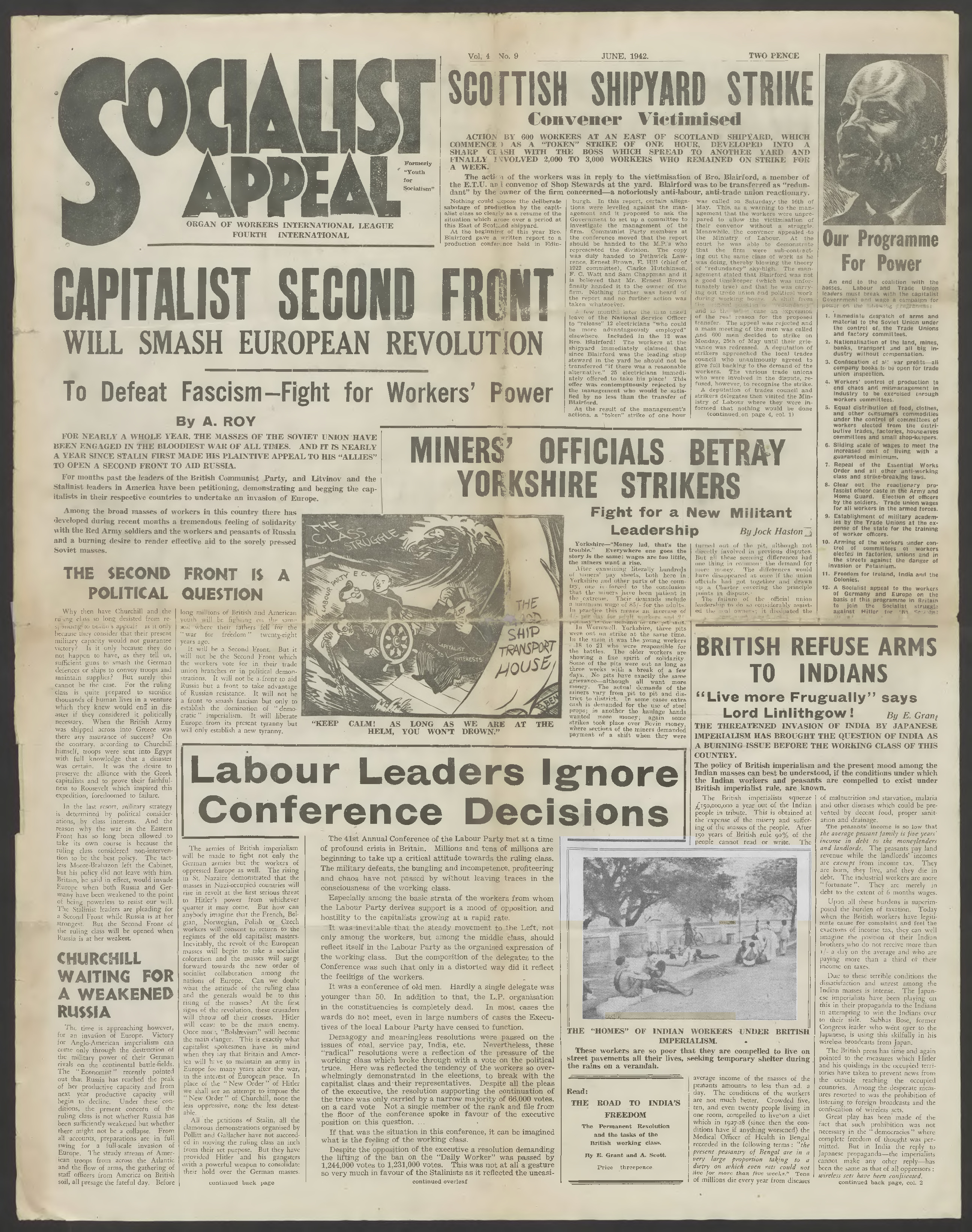 Scottish shipyard strike – Capitalist second front will smash European revolution – Our program for power - Miners’ officials betray Yorkshire strikers - British refuse arms to Indians – Labour leaders ignore conference decisions – Clyde workers begin to savvy production committees – Letter from girl striker to her soldier husband – Read : an ABC of Trotskysm, the testimony of Cannon in the U.S. frame-up trial – Open the books for workers’ inspection – Editorial : Coal crisis, “No half and half measures” – Communist Party brands us fascist - They call for peace on Hitler’ terms – Consumers’ committees only reply to food combines – C.P. policy in the Royal ordnance factories – Henricus Sneeveliet executed by Nazis – Look at their record. On our “freedom loving” Allies.