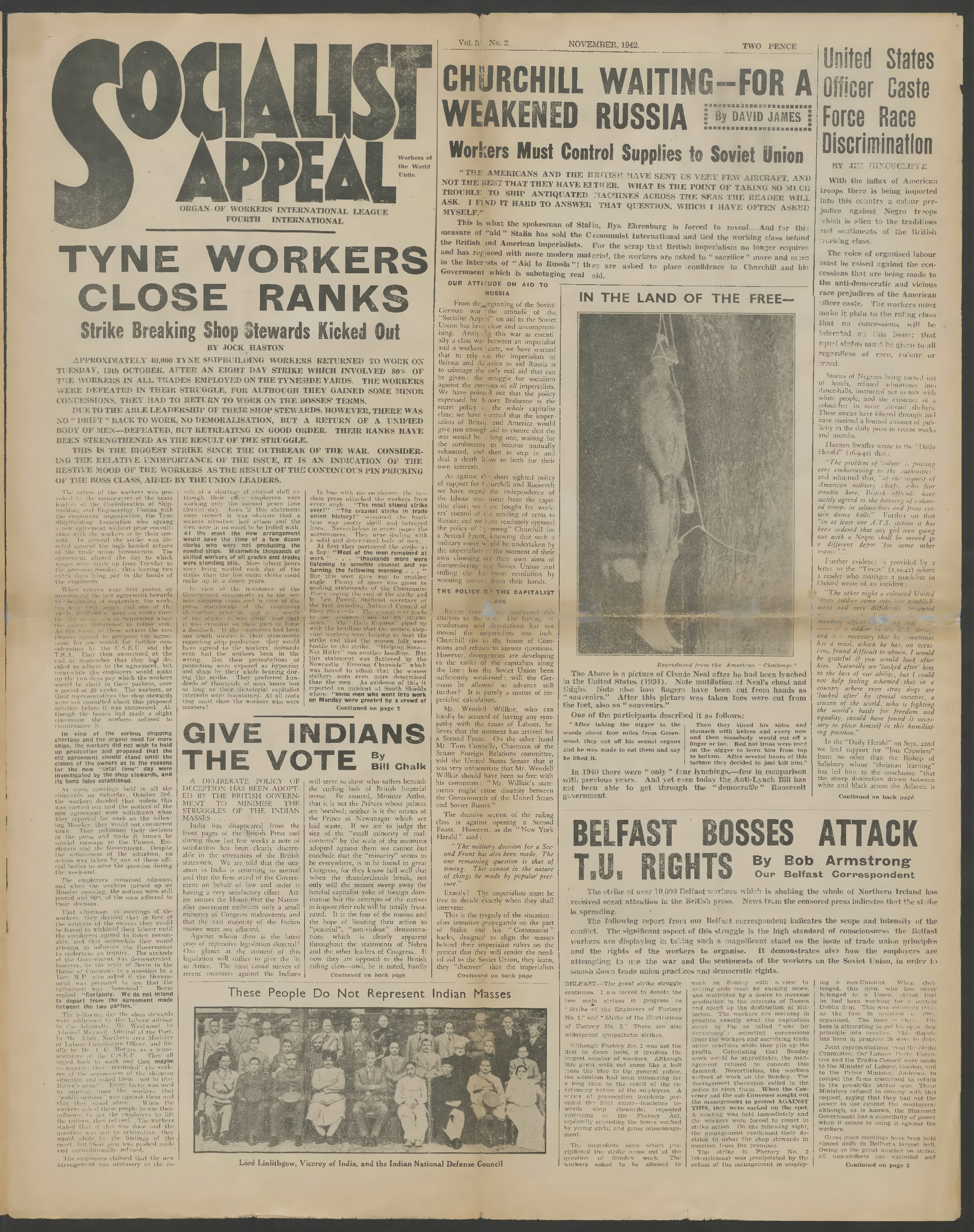 Tyne workers close ranks – Churchill waiting for weakened Russia – United States officer caste force race discrimination – Give Indians the vote – Belfast bosses attack T.U. rights – Vickers shipwrights win victory – Marchbanks betrays Lincoln bus workers – Correspondence : From a forestry worker ; Durham miner on the home guard ; Glasgow engineers fight for bonus – Editorial : “United strategy” – Russian Revolution and the 4th International – We continue Lenin’s policy – “Concessions” to China – Stalin cannot blot out history – Fight for democracy in the forces.