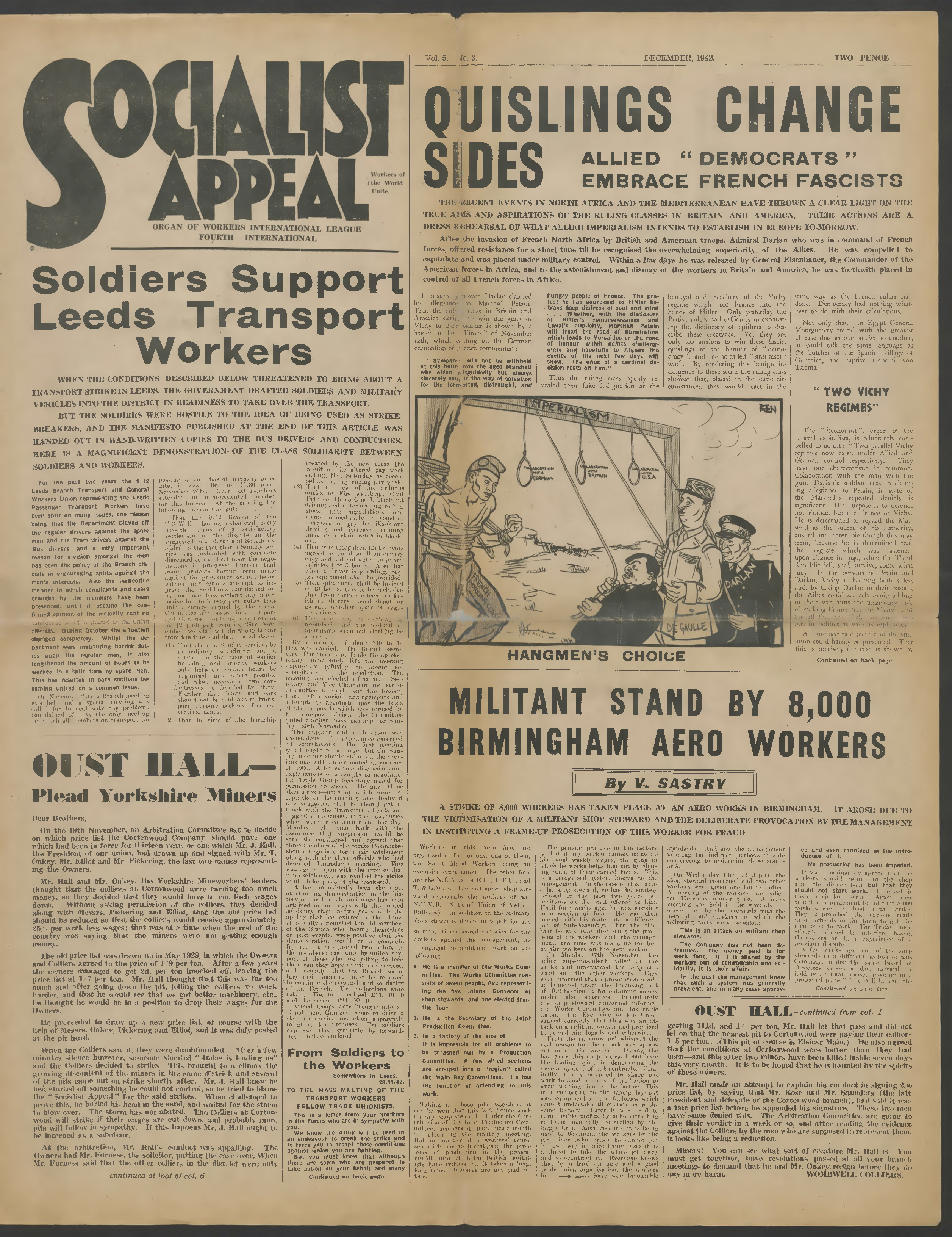 Quislings change sides. Allied “democrats” embrace French fascists – Soldiers support Leeds transport workers – Oust hall plead Yorkshire miners – Militant stand by 8 000 Birmingham aero workers – Clyde ship bosses provoke workers – Dockers cheated by transfers – Correspondence : Concrete workers appalling conditions ; From Brixton amalgamated engineering union – Capitalism restricts fuel output – Russian Revolution meeting – Signalmen demand action – Editorial : After the war – Wainwright and Doriot birds of a feather – We continue Lenin's policy – Birmingham workers demand Indian freedom - French workers foil fascists – Manifesto of the Fourth International to the masses of India – Midland miners win strike – Stalinism or Leninism in soviet Russia – Darlan joins “democrats.”