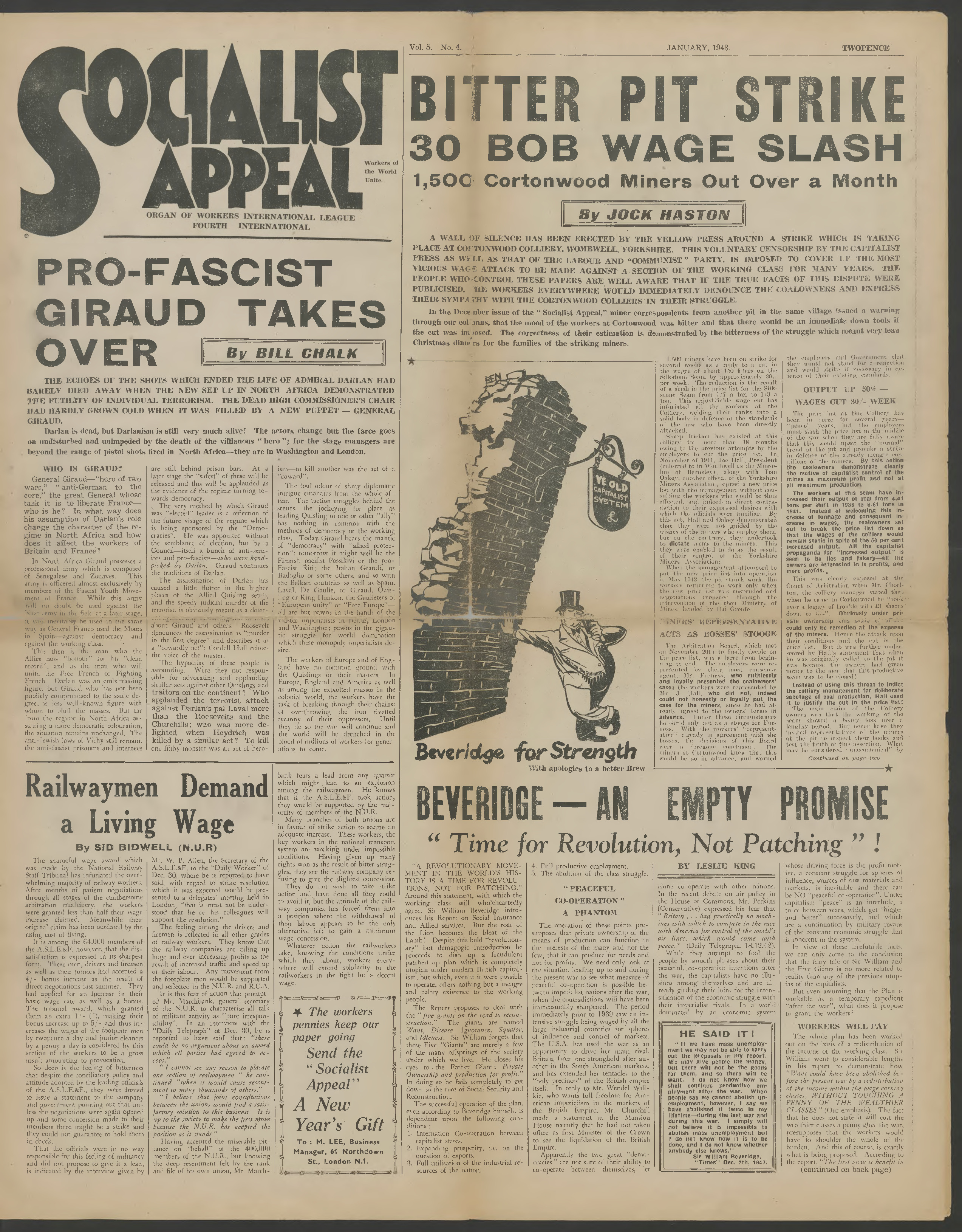 Bitter pit strike, 30 bob wage slash – Profascist Giraud take over – Railwaymen demand a living wage – Beveridge, an empty promise – What the Socialist Appeal stands for – Open letter to the Yorkshire miners – Correspondence : On Leeds transporte dispute from soldiers, from a Leeds bus driver – Building workers must close ranks – Cortonwood miners increase production, owners slash their wages – Stalinists attack Cortonwood miners – Read an ABC of Trotskysm – Rhodesian miners leaders arrested – Editorial : 1943, our Party and paper – How Lenin’s propaganda won German masses – 700 allied seamen in U.S. Jail - John Reed and the Communist Party – Salute to three great revolutionaries [Lenin, Luxemburg, Liebknecht] – Anti-soviet talk among British officers – Industrial militants need a programme – Plight of the Jews – Industrial programme of Workers International League.