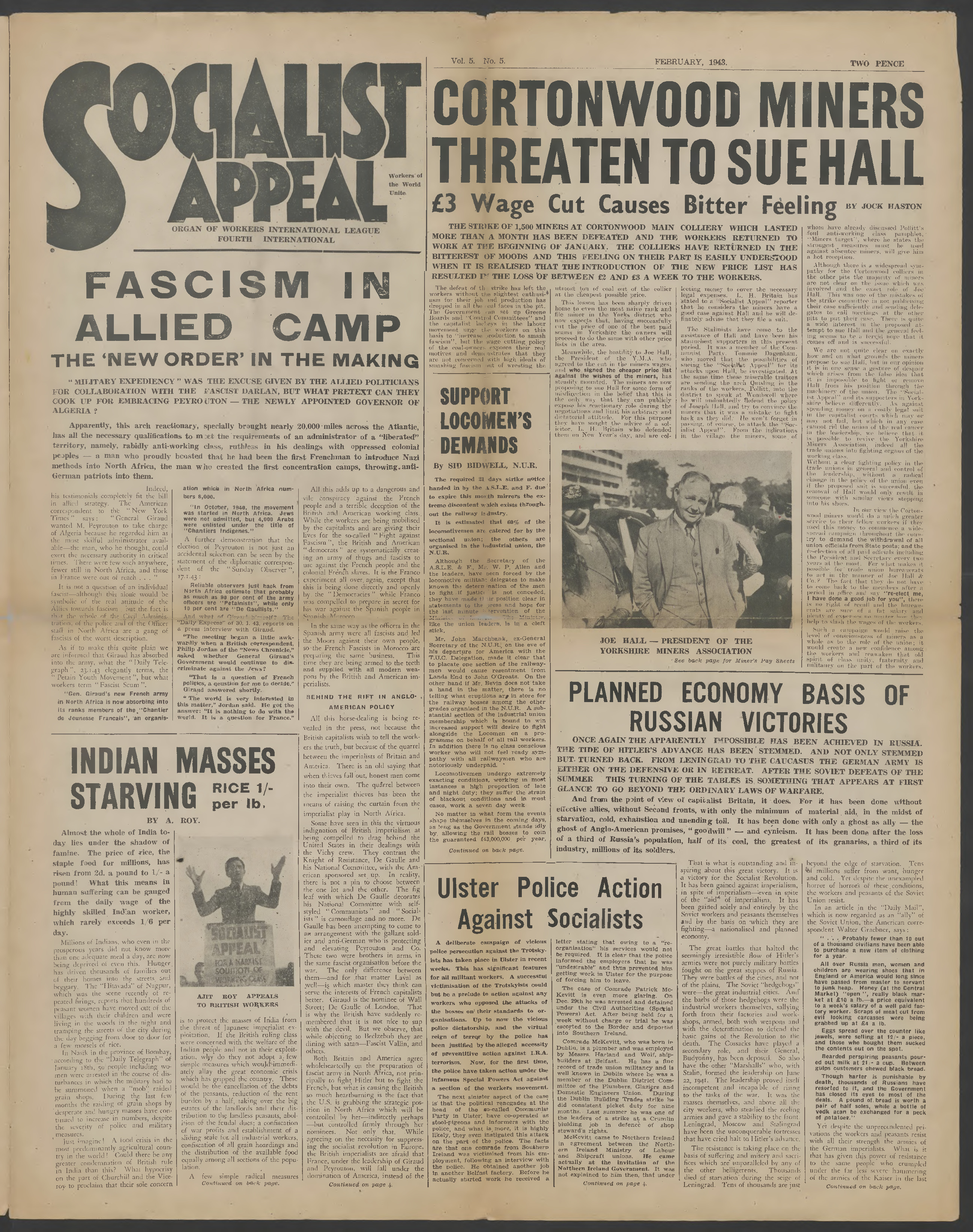 Cortonwood miners threaten to sue Hall – Fascism in allied camp – Support locomen’s demands – Planned economy basis of Russian victories – Indian masses starving – Ulster police action against socialists – Our programme for power – 1 800 Coventry miners strike – Lanarkshire, works delegate victimised – Correspondence : Film workers fight for higher wages ; B.B.C. Broadcast “scrabs rewaerd” ; From a soldier in Egypt – Essential works order, tool of the bosses - Two victories for Midland engineers – Housin scandal, take over the mansions ! - Landowners victimise Irish workers – Victory for Notts [Nottingham], drivers and firemen - Editorial : the Fourth International – Allies preparing domination of Europe – The Jewish question – International bank “trading with the enemy” – Wainwright blunders again on the Chinese revolution – Bob Armstrong released – Miners’pay sheets.